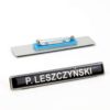 Wymiary: szerokość 11 mm, długość 77-100 mm (w zależności od długości nazwiska - standardowo 80 mm.). Ramka o szerokości 1,3 mm. Grubość przezroczystej żywicy polimerowej 1 mm