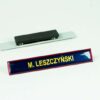 Wymiary: szerokość 13 mm, długość 80 mm (w zależności od długości nazwiska - standardowo 80 mm.). Ramka o szerokości 1,5 mm. Grubość przezroczystej żywicy polimerowej 1 mm